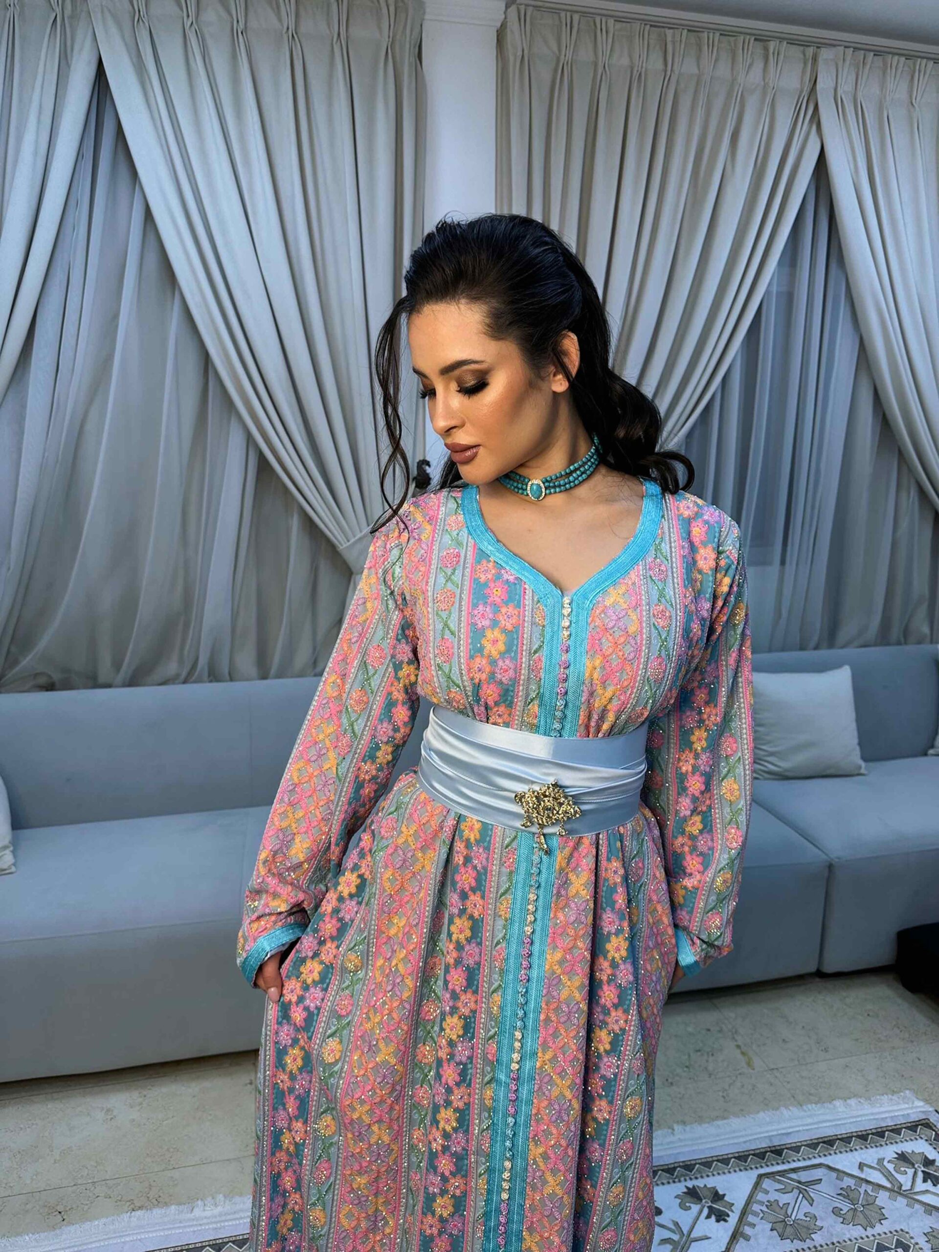 Adorned with hand-applied stone embellishments, the design draws inspiration from classic Moroccan silhouettes, blending intricate craftsmanship with refined sparkle. Whether you’re dressing for Eid, a wedding, or a formal gathering, this caftan offers the perfect combination of comfort, modesty, and glamour.